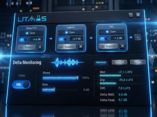 Your Objective Mix Assistant Hear what your plugins actually do. Litmus is an internal plugin host that lives right in your mix chain and acts as an objective second set of ears. Insert Litmus, load your favorite VST3/AU processors inside it, and mix as normal with automatic gain-staging, delta monitoring, and blind A/B testing on every move.